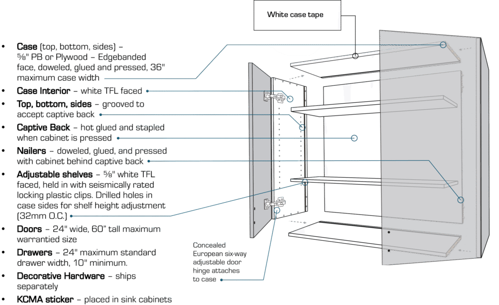 In the tradition of fine cabinetry, our face frame cabinet collections have solid wood frames to which the cabinet doors and hinges are attached. The face frame is composed of vertical stiles and horizontal rails. The doors are offered in full overlay. Full overlay provides a larger door and wider overlay to conceal more of the face frame.