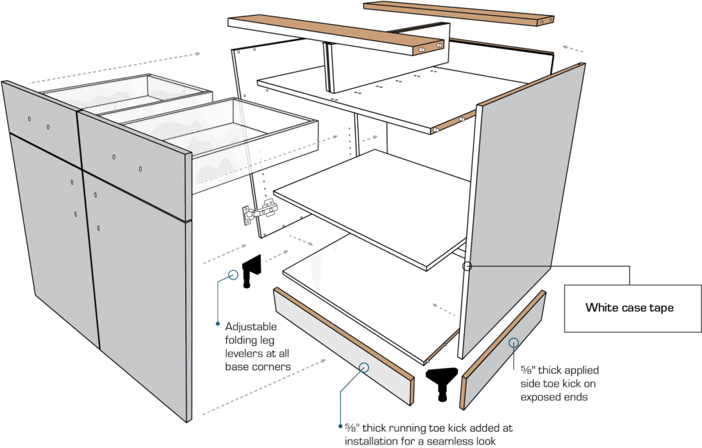 Plywood core cabinets offer the most durability and a great choice for high-use situations. Integrated finished ends that match door faces in TFL and thermofoil will be constructed with particle board or MDF core.