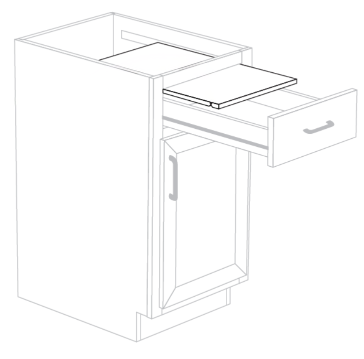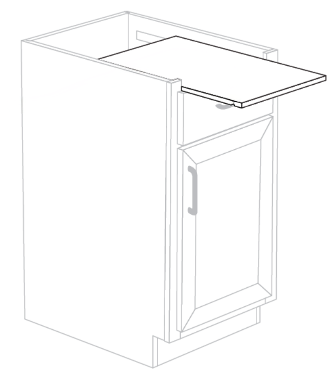 FRAMELESS: May qualify as a secondary workspace in adaptable units, dependent on the countertop, sink, and floor specifications. Glides on metal rails and retract flush to close.