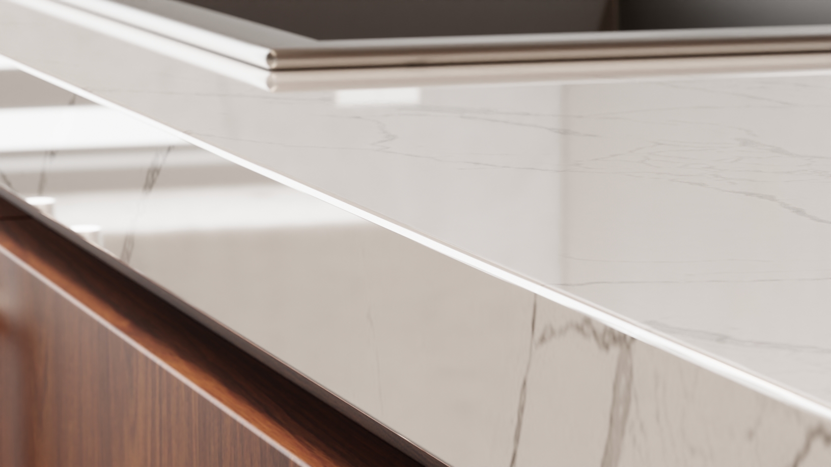 CALACATTA quartz presents a captivating blend of soft whites and earthy sharp hues, featuring bold, sweeping veins that create a dynamic visual appeal. The interplay of colors evokes a sense of natural beauty, reminiscent of many luxurious marble finishes.