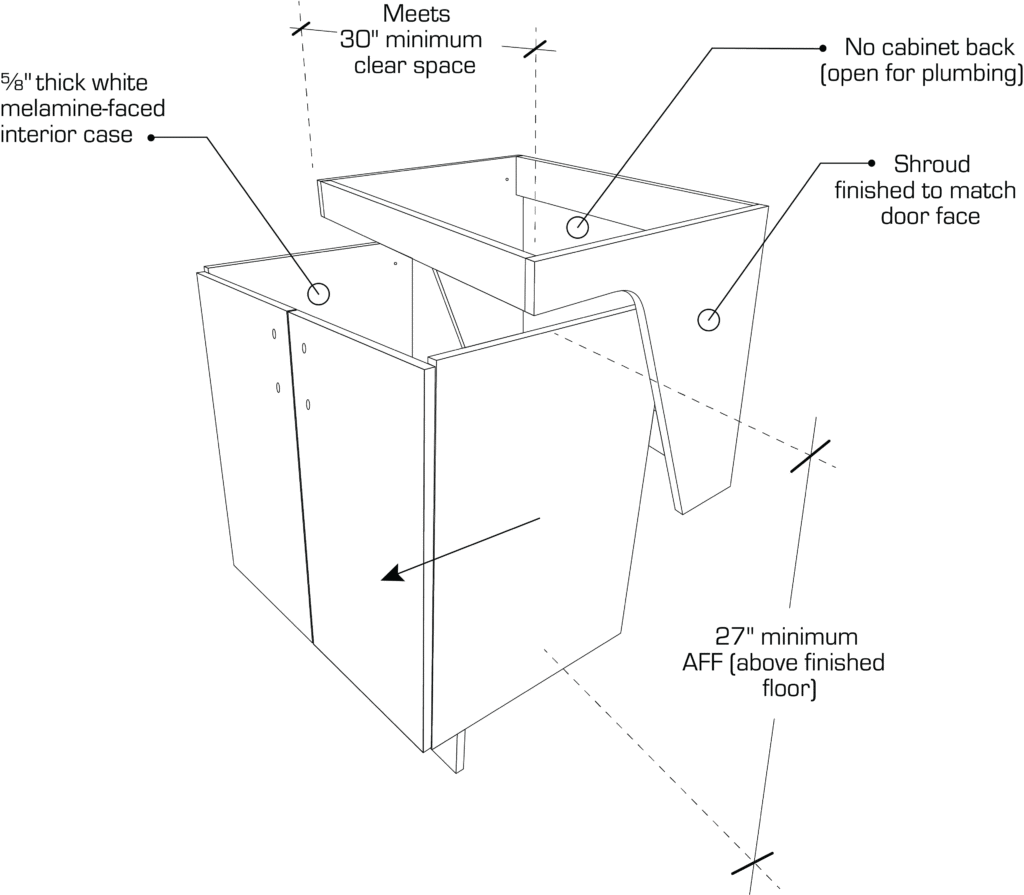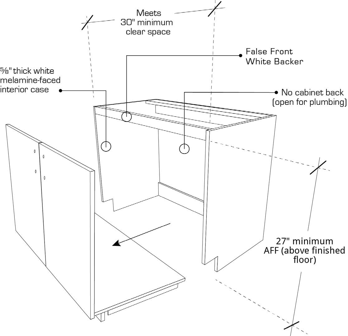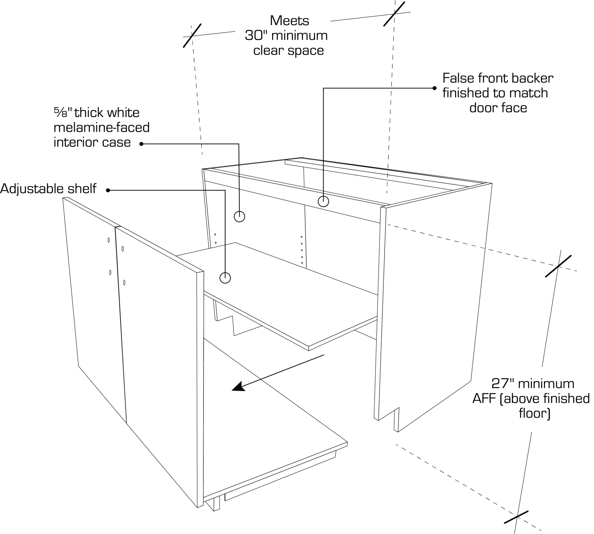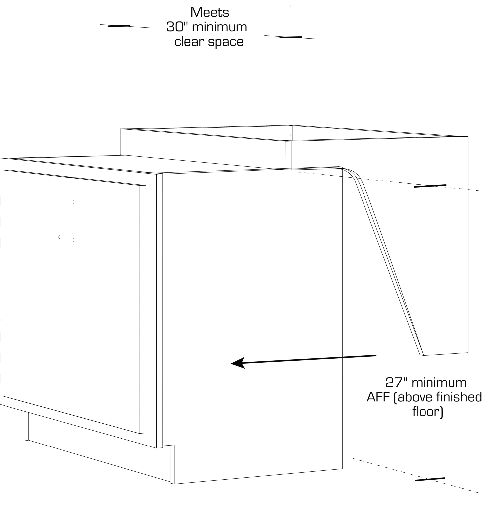Our designers at Lanz Cabinets are well versed in jurisdictional code for ADA (American Disability Act) compliance. Our Removable Deck and Toe (RDT) cabinets look seamless in a row of base cabinets yet remove easily to allow access. Choose from sink bases, workspaces with drawers and shrouds.