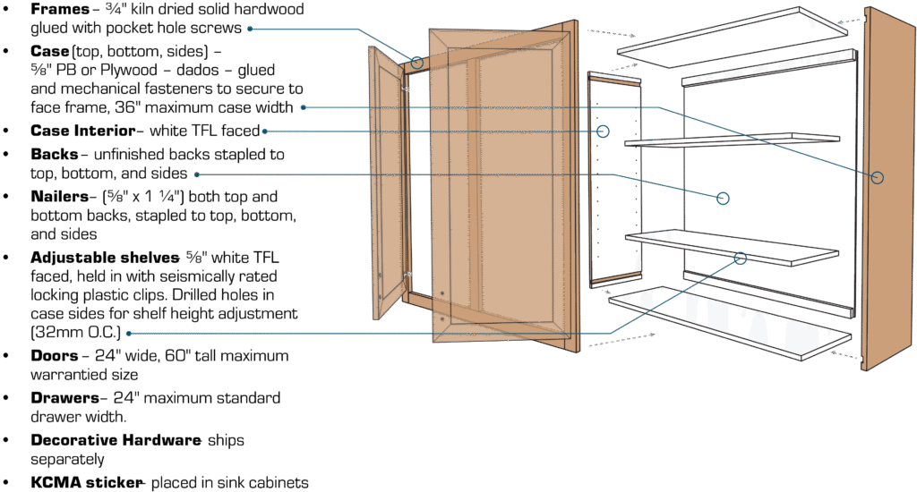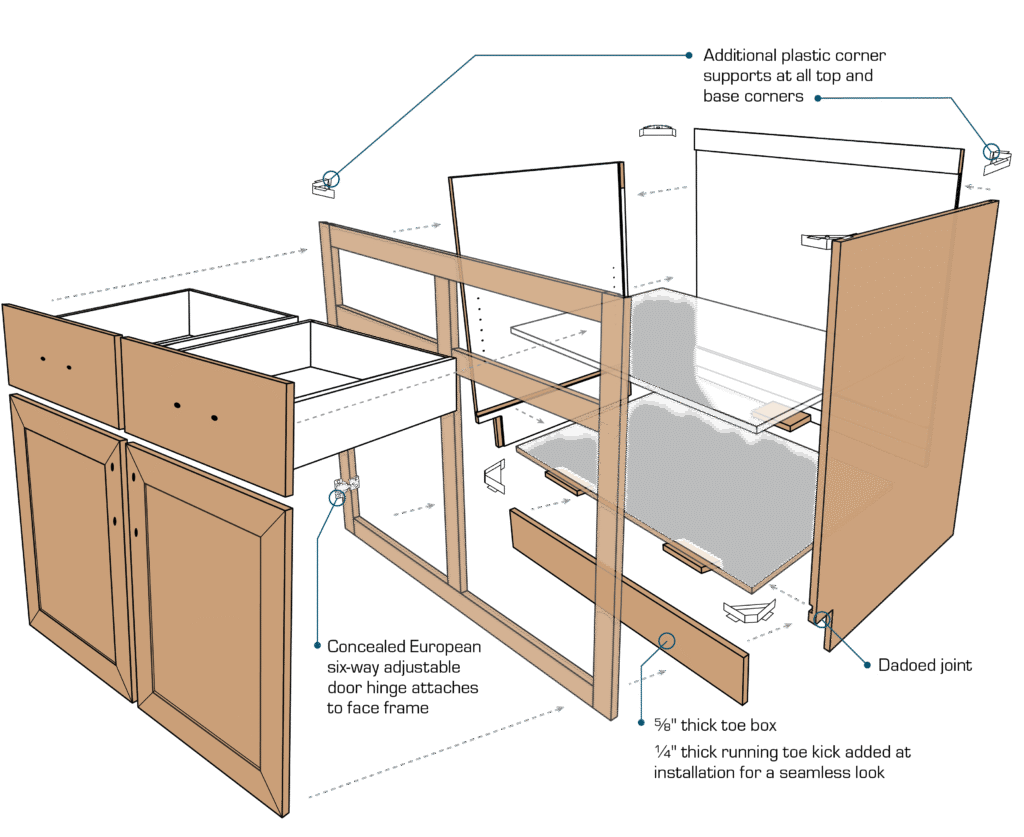 Plywood core cabinets offer the most durability and a great choice for high-use situations. Integrated finished ends that match door faces in TFL and thermofoil will be constructed with particle board or MDF core.