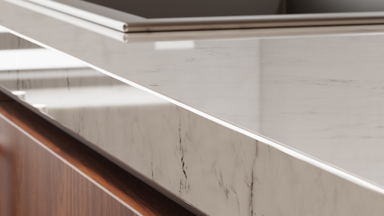 CALACATTA quartz presents a captivating blend of soft whites and earthy sharp hues, featuring bold, sweeping veins that create a dynamic visual appeal. The interplay of colors evokes a sense of natural beauty, reminiscent of many luxurious marble finishes.