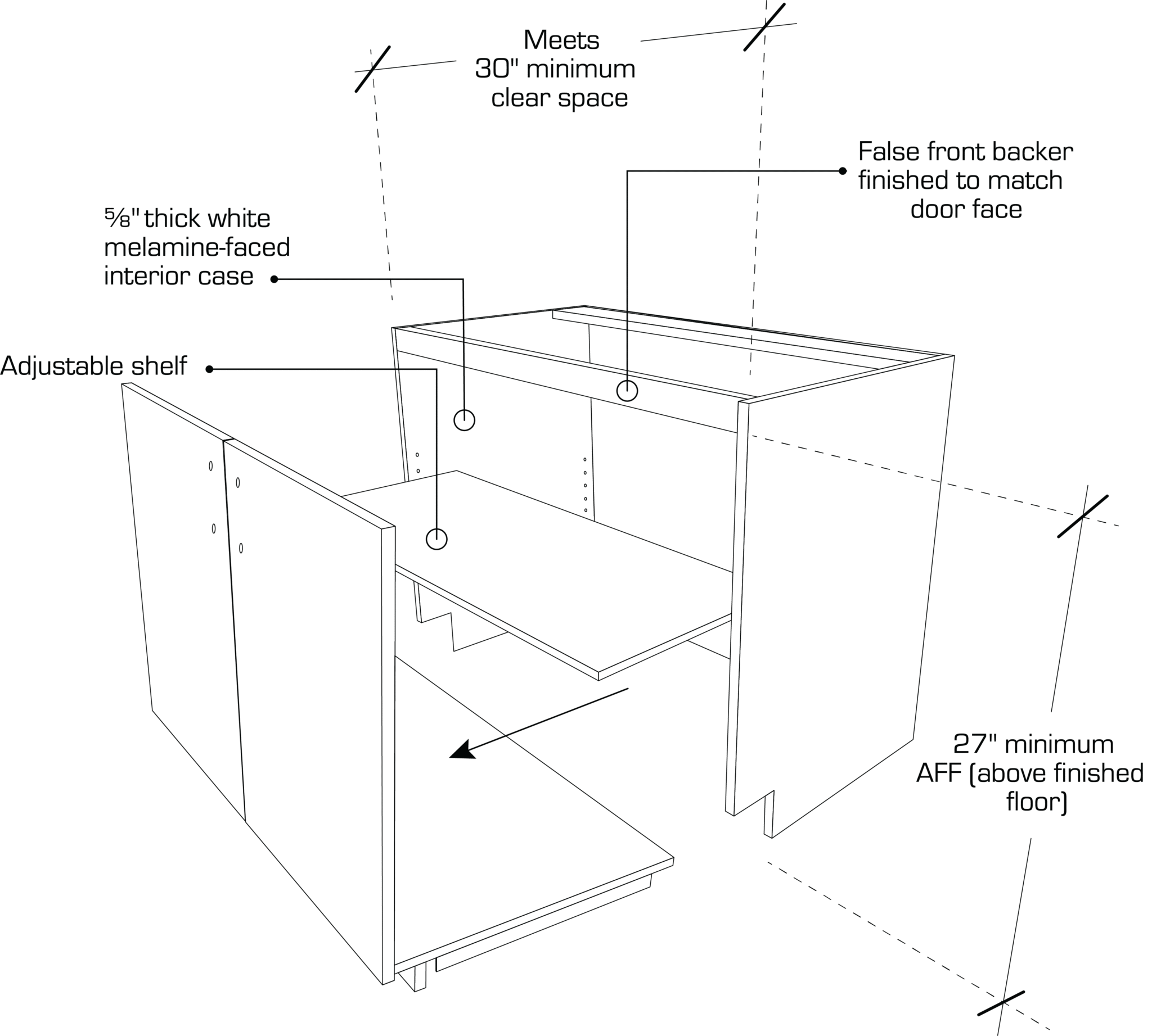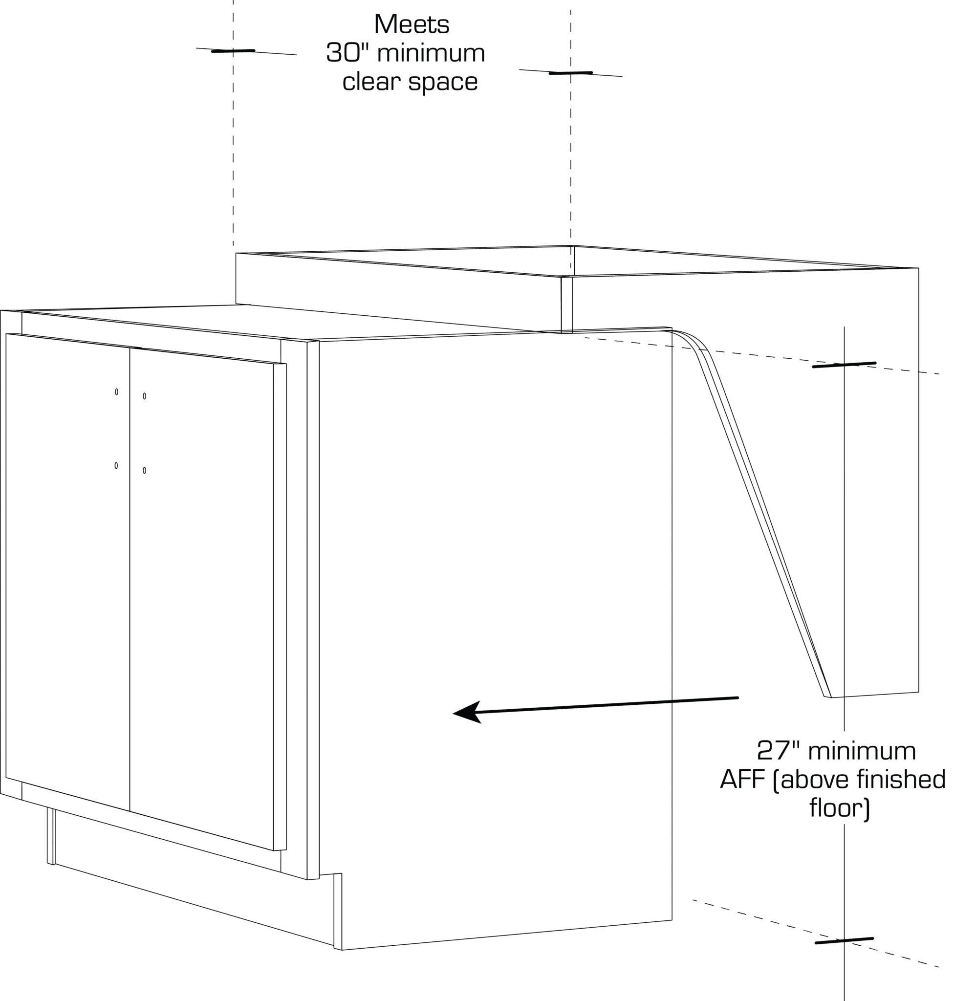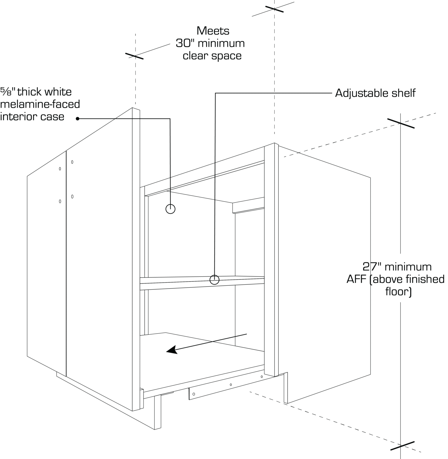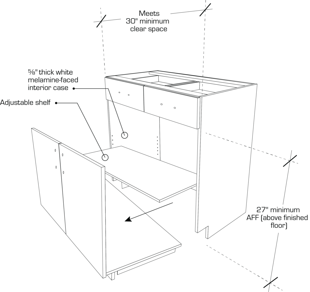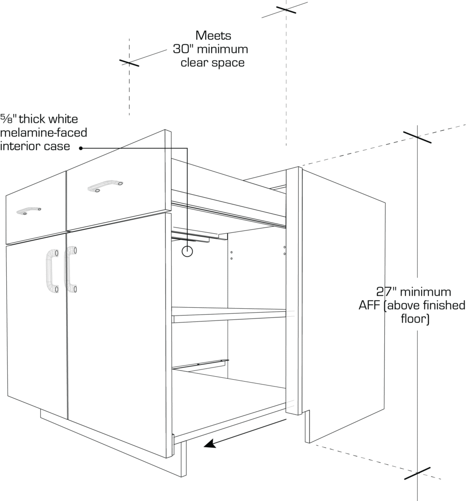 Our designers at Lanz Cabinets are well versed in jurisdictional code for ADA (American Disability Act) compliance. Our Removable Deck and Toe (RDT) cabinets look seamless in a row of base cabinets yet remove easily to allow access. Choose from sink bases, workspaces with drawers and shrouds.