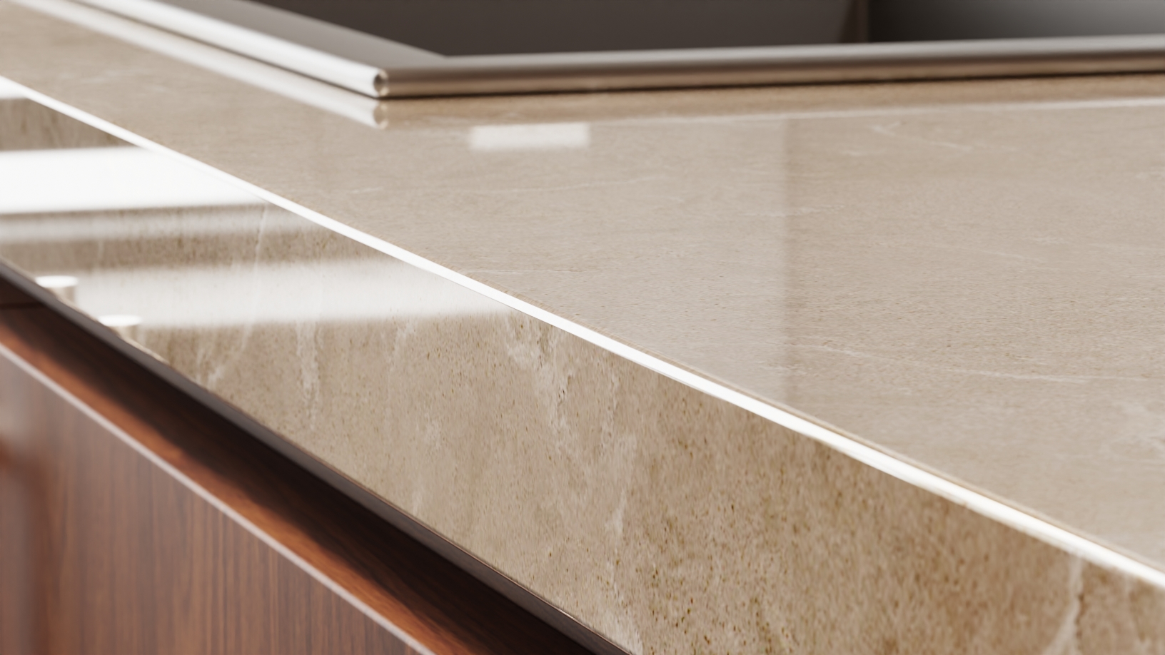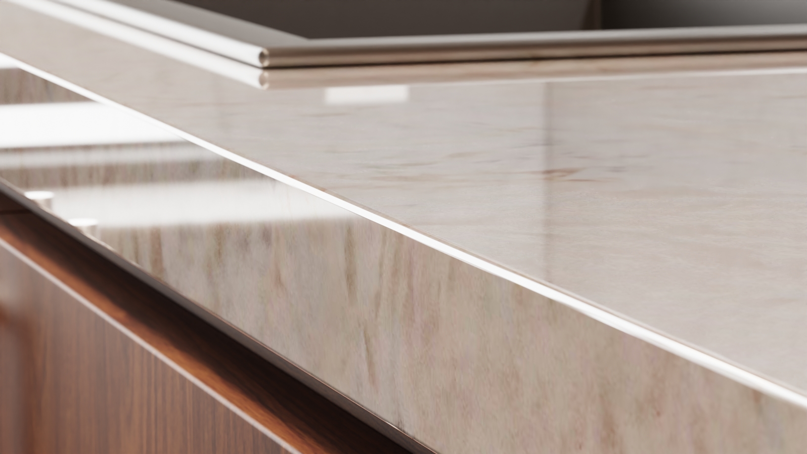 FREE SKY quartz features a soft white base with swirling, cloud-like patterns that create a serene and dynamic surface. The subtle textures evoke a sense of lightness, making it the perfect choice to brighten any space.