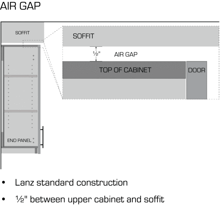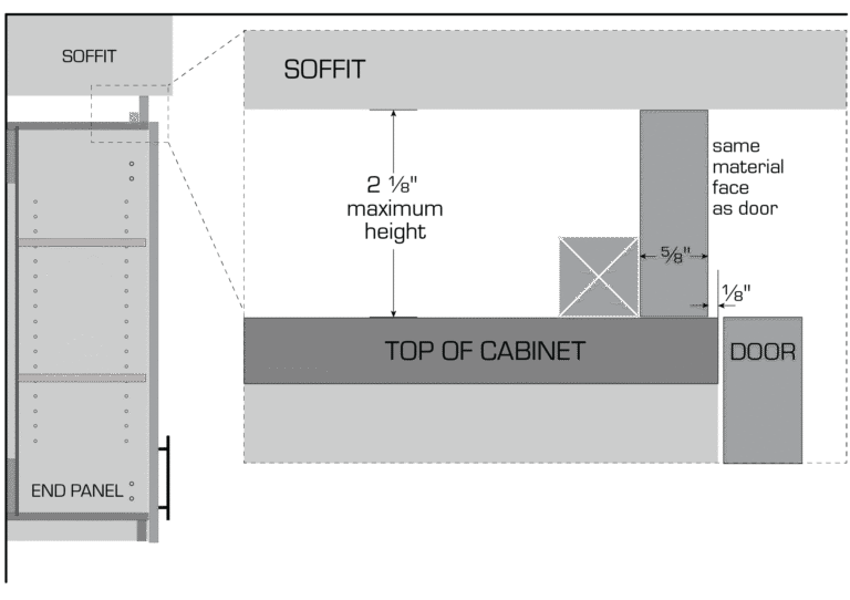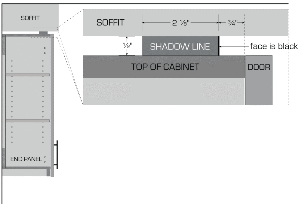 When frameless cabinets have a soffit above the upper cabinets, a top valance and shadow line can reduce the dark line and lessen the appearance of inconsistencies of a drywalled soffit. Adding a Crown above the cabinets that are flush with the door face adds a custom, modern look.